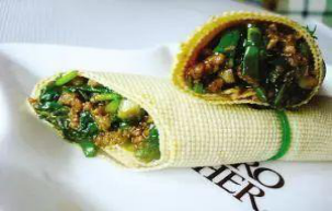 配料:焯水后的芹菜叶300g、香菇100g切末、猪肉末50g、胡萝卜切末50g、香葱20g切末、稀黄酱15克、花椒油15g、薄豆皮100克。
